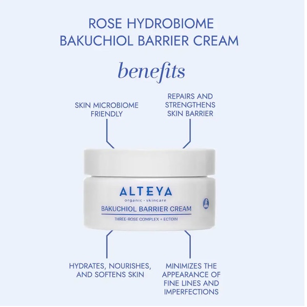 Alteya Organic Bakuchiol Barrier Cream is created in Alteya’s advanced cosmetic lab, this product features a proprietary Three-Rose Complex made from potent extracts of organic Rosa Damascena, Rosa Alba, and Rosa Centifolia sourced from Alteya’s organic rose gardens.