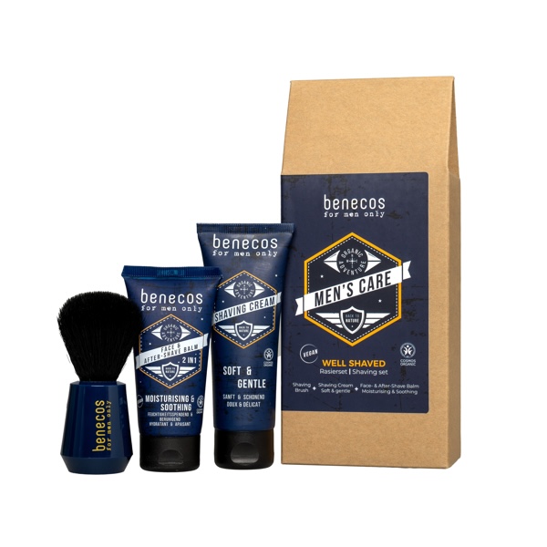 Benecos Men’s Well Shaved Gift Set: The vegan brush provides optimal pre-shave preparation and is the perfect complement to the shaving cream. It foams lightly and nourishes with organic aloe vera juice. The 2-in-1 Face & After-Shave Balm, with regenerating verbena hydrosol, leaves skin feeling soft and supple.