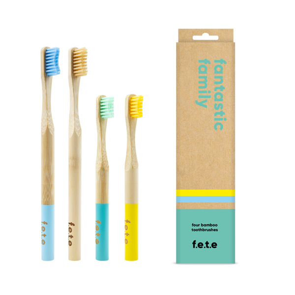 f.e.t.e’s family pack bamboo toothbrushes contain two adult medium bamboo toothbrushes and two kids soft toothbrushes.