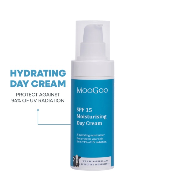 Introducing the MooGoo SPF 15 Moisturising Day Cream, sun protection plus moisture and hydration for skin.